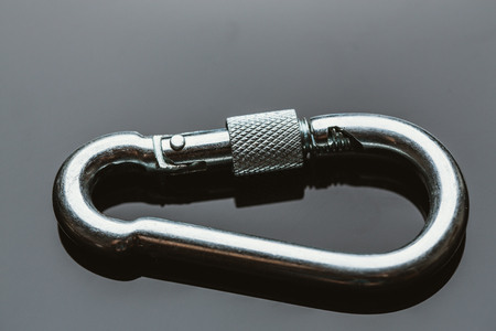 One metal carabiner on black table. Safety equipment