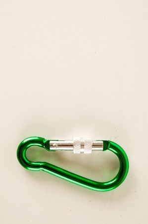 Nice colors. Isolated photo of climbing equipment. Part of carabiner lying on the white and grey colored surface.