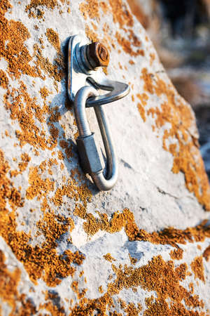 Сlimbing carabiner hook and trigger device in stone. Carabiner for mountaineering on rocky background . Extreme sport concept.