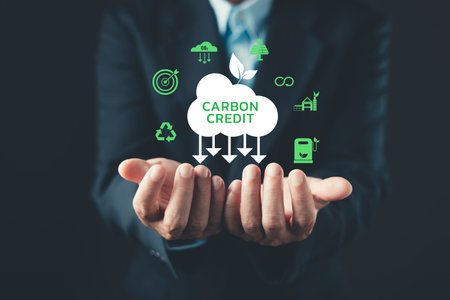 businessman holds digital icons around a cloud labeled carbon credit, representing environmental responsibility, carbon reduction, sustainable energy, recycling, and eco-friendly business practices.