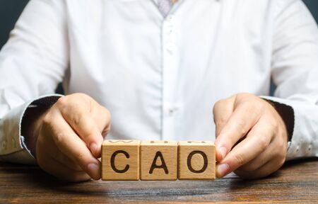 Man holds the word CAO in hands. Chief Accounting Officer. Vacancy and duties of a specialist. Manage taxes and payroll. Develop and upgrade finance systems in business. financial executives,
