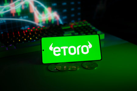 Dhaka, Bangladesh 18 September 2025:EToro logo on phone with coins and stock chart backdrop, evoking digital trading atmosphere