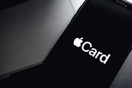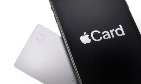 closeup iPhone with Apple Card logo on the screen and physical Apple Card. Apple is a multinational technology company. Moscow, Russia - March 26, 2019
