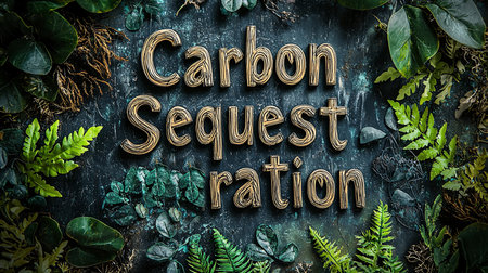 Hand-drawn lettering of carbon sequestration surrounded by green leaves, emphasizing environmental themes and sustainability in a natural setting.