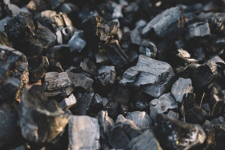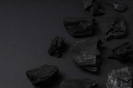 Group of charcoal black color made from real wood in studio close-up shot which use for cooking or absorb odor in room or refrigerator. And use in some cosmetic industry.