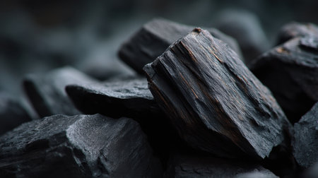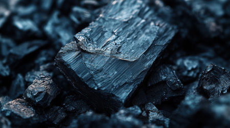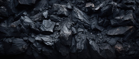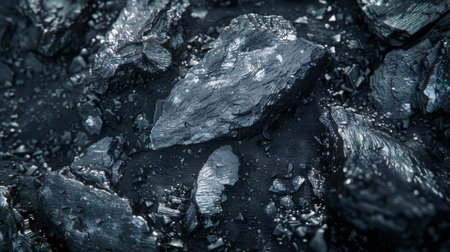 Close-up of a dark, heavy heap of varied coal, highlighting intricate details and rough edges. AI generative.
