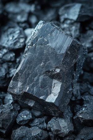 Close-up view of high-quality coal pieces on dark surface highlighting texture and shine, showing natural minerals in a mining area during midday