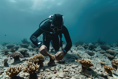 Reef Restoration, Diver Plants Small Corals on Ocean Floor, Restoration of Dead Corals, Coral Plantation, Generative AI Illustration