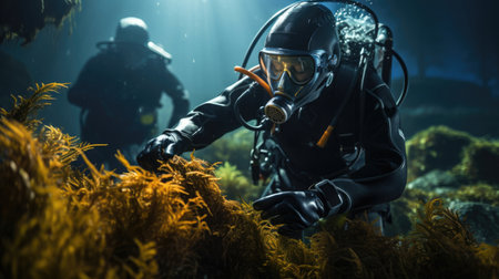 People in scuba gear collect algae on seaweed farms. Sustainable ocean ecosystems
