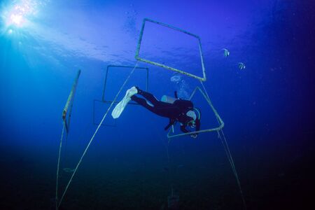 Underwater view of diver fixing a tube, seacrete, (artificial steel reef with electric current),
