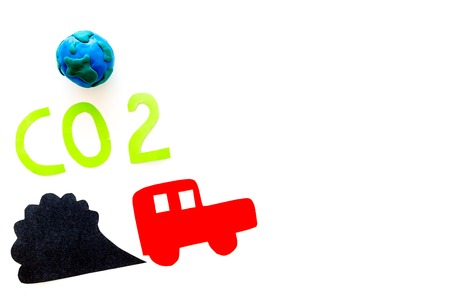 Car pollutes the environment by carbon dioxide. Car, environment and CO2 cutout on dark wooden background top view copy space