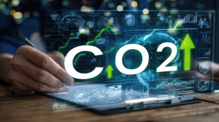 An image presents a person's hands interacting with a digital display showing CO2 levels. The visual incorporates graphs and a rising green arrow, suggesting an upward trend. The composition uses a dark, blurred background and a focus on the central subject, suitable for various editorial and commercial applications.