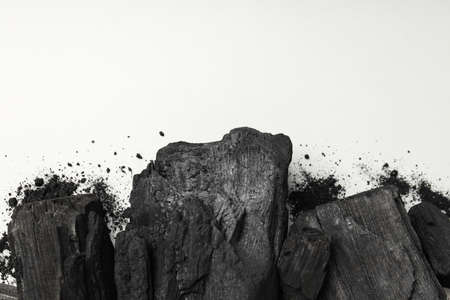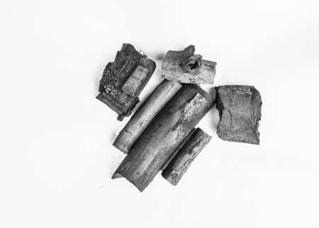 Natural black hardwood charcoal on white background