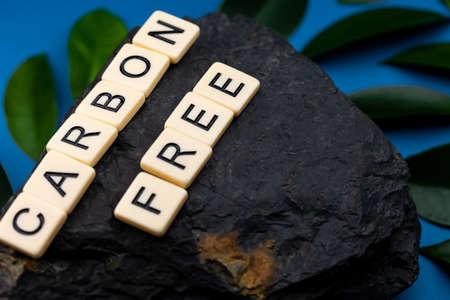 A lump of coal arranged on a blue background with the sentence carbon free composed of letters. Green leaves in the background. Photo taken under artificial, soft light