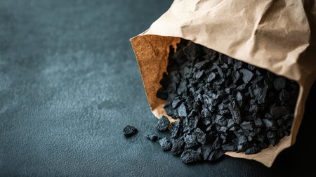 Green packaging: A paper bag filled with biochar, showcasing a sustainable and environmentally friendly alternative to traditional packaging materials.