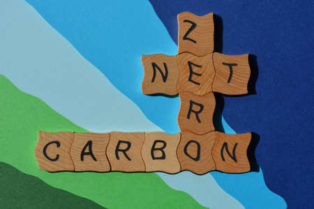 Net, Zero, Carbon, words in wooden alphabet letters in crossword form