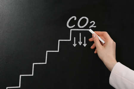 Reduce carbon emissions. Woman drawing stairs and chemical formula CO2 on blackboard