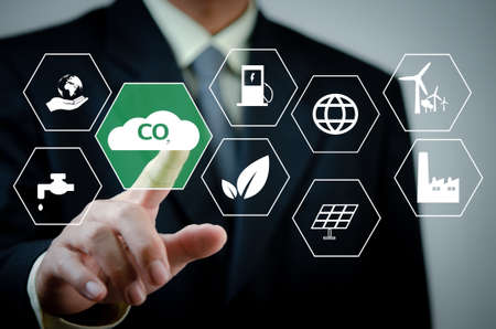 businessman hand touches global warming Renewable energya virtual screen. Reduce CO2 emissions. Sustainable business development concept .