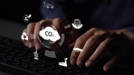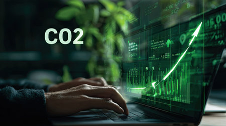 A person interacts with a laptop, which showcases a graph representing CO2 emissions. The image uses green and black tones, with an upward-trending line. The composition suggests an office environment, possibly related to environmental monitoring or business analysis. It is suitable for commercial and editorial purposes.