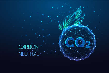 Carbon neutral, net zero emission concept with CO2 inside of sphere and green leaves on dark blue