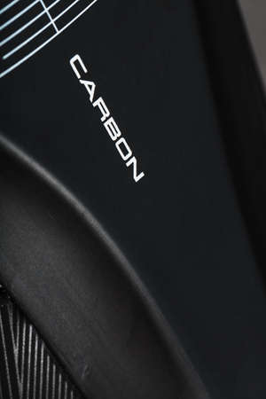 Composite product made of carbon fiber with the inscription CARBON and a distance scale. Macro, close-up