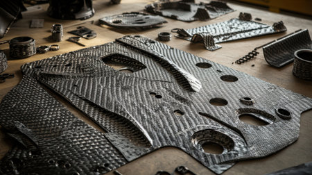 Explore a captivating arrangement of carbon fiber components laid out on a workbench, showcasing the intricate textures and patterns essential for engineering and design projects.