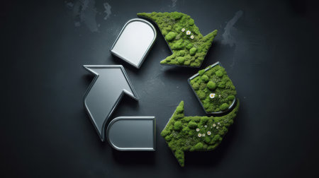 A recycling symbol composed of three arrows. Two arrows are filled with vibrant green moss and small white flowers, while the third arrow is a sleek, reflective silver.