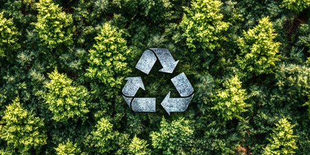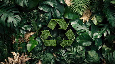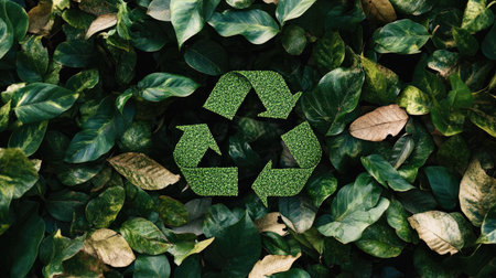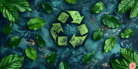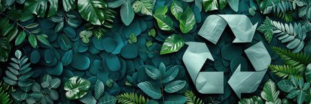 A flat lay of a green recycling symbol surrounded by natural leaves, highlighting the blend of nature and sustainability in eco-conscious living. Ample copy space included.