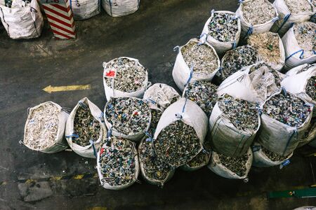 Bags with recycled plastic at a waste sorting plant. Separate garbage collection and sorting. Recycling