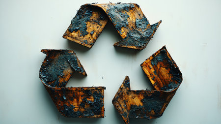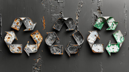Artistic depiction of rusty recycle symbols against a peeling black paint backdrop symbolizes the persistent effort in environmental conservation and sustainability.