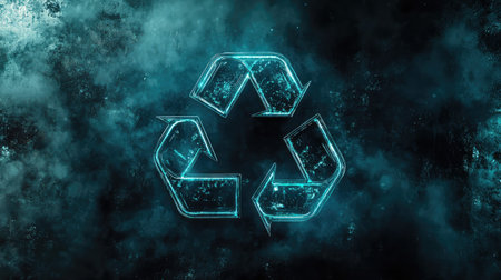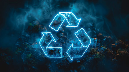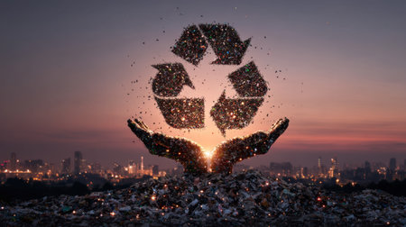 Creative representation of recycling, featuring glowing recycling symbol formed from particles, emerging from hands above pile of waste. This conveys hope and importance of sustainability