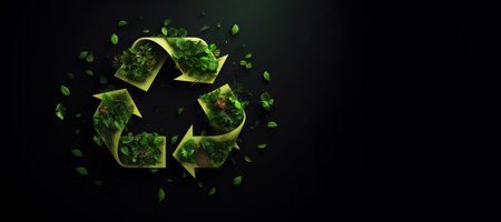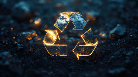 This captivating image illustrates a circular economy concept featuring recycle symbols and product arrangements on a dark background. It emphasizes sustainability.