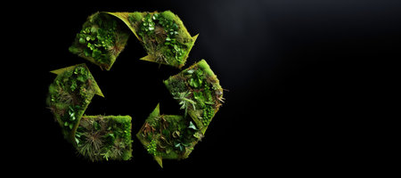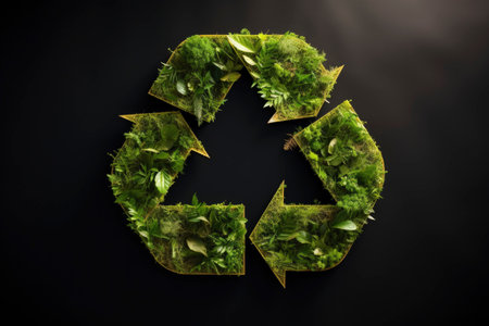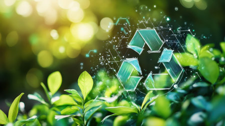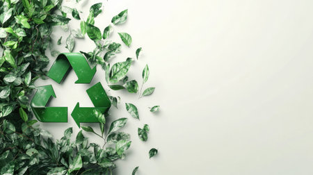 A vibrant green recycling symbol intertwined with fresh leaves, symbolizing the harmony between recycling and nature. Perfect for promoting eco-friendly practices. Space for text. -