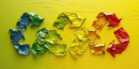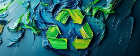 A vibrant design with a 3D recycling symbol made from colorful, abstract paint strokes in shades of green and blue, with a glossy texture.