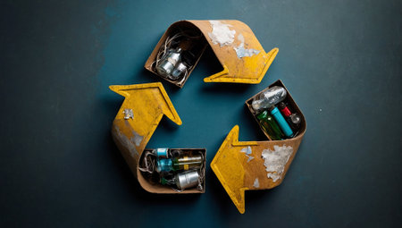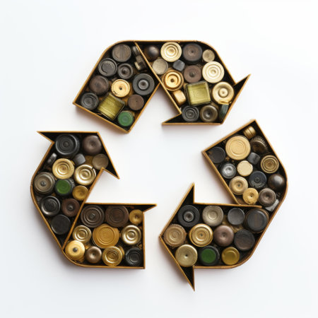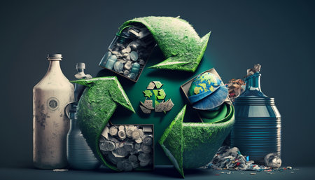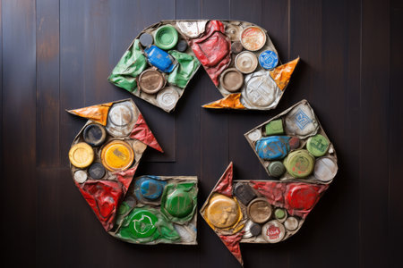 This unique image features a recycling symbol crafted from crushed plastic bottles and cans, highlighting the importance of sustainable practices and environmental responsibility.