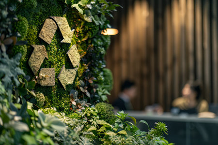 A close up of a green recycle symbol surrounded by foliage in a modern office space, with blurred silhouettes of people engaging in conversation in the background. The scene is bathed in warm, natural light, emphasizing sustainability and environmental awareness.