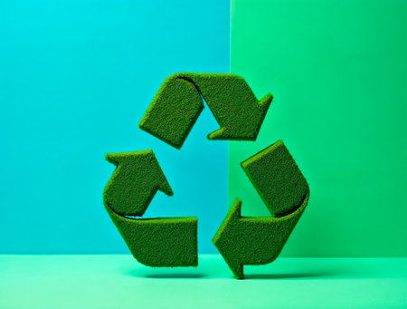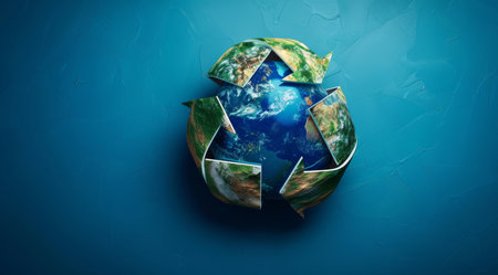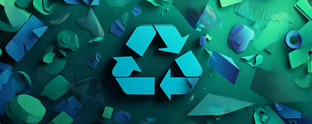 A vibrant background with a 3D recycling symbol in shades of blue and green, surrounded by dynamic, abstract shapes and textures to highlight sustainability.