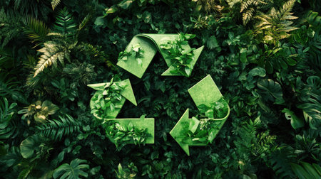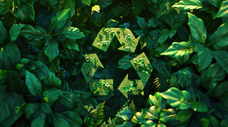 Stylized 3D rendering of a recycling symbol surrounded by green foliage, emphasizing recycling practices with this inviting photo.