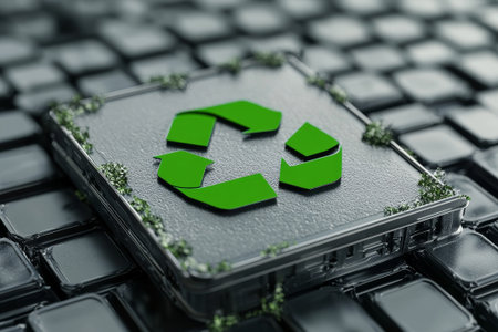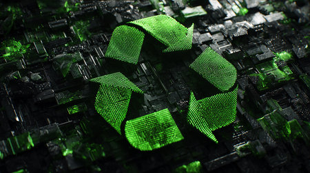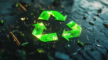 A vibrant glowing green recycling logo set against an abstract background, symbolizing eco-friendliness and sustainability through modern design and technology.