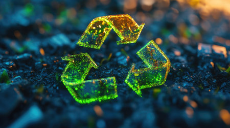 Glowing 3D recycling symbol with vibrant green arrows, symbolizing environmental awareness.