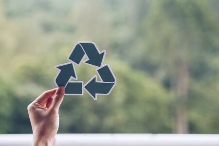 Hand holding recycling symbol created with paper cut and landscape on background, Concept of environmental conservation and protection.