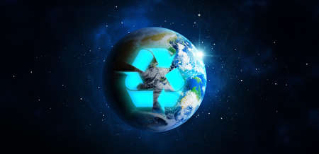 Illustration of recycling symbol and Earth in starry sky. banner design