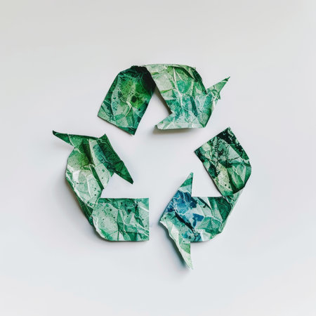 Eco friendly recycling symbol made from green and blue paper, representing sustainability and environmental awareness, suitable for promoting eco conscious initiatives and practices
