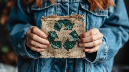Close-up of hands presenting a burlap fabric with a green recycle symbol, emphasizing eco-friendliness and environmental awareness.