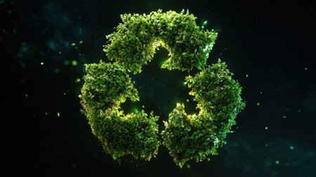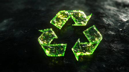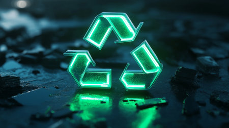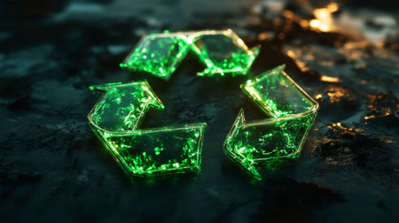 Luminous 3D recycling symbol with green elements on a black background, emphasizing eco-consciousness.