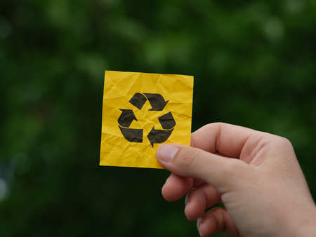 A woman holding a yellow sticky note with a recycle symbol on it in her hand against a background of foliage. close up.