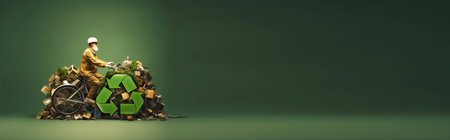Garbage collector standing near a large pile of waste, promoting recycling and environmental awareness. Green design elements emphasize sustainability.