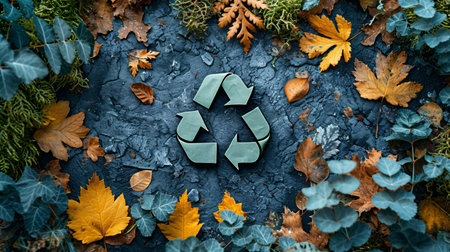 A vibrant recycling symbol set against a rich backdrop of autumn leaves and dark earth, emphasizing eco-friendliness and nature's beauty. Perfect for sustainability themes.