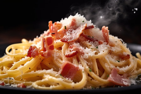 Spaghetti carbonara with bacon and parmesan cheese on black background