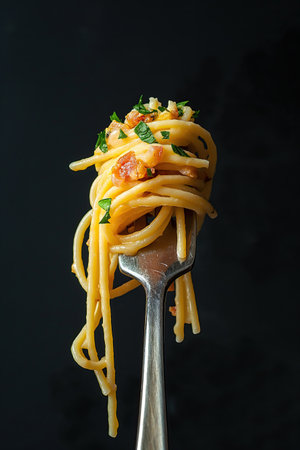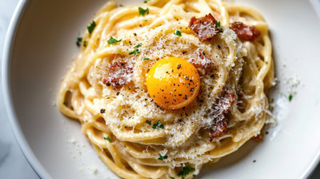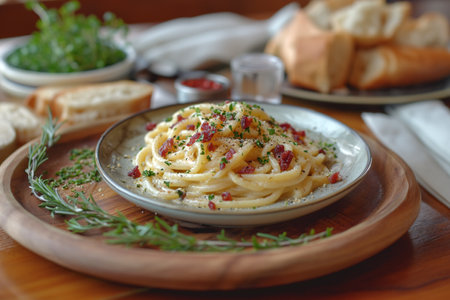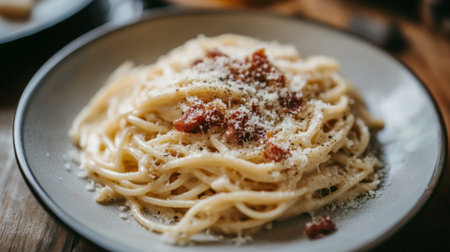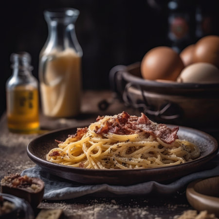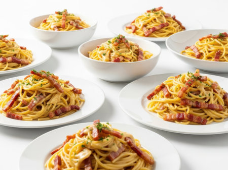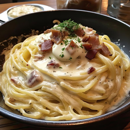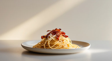 A beautifully plated bowl of spaghetti carbonara, showcasing rich flavors and a delightful creamy sauce, perfect for gourmet dining experiences.